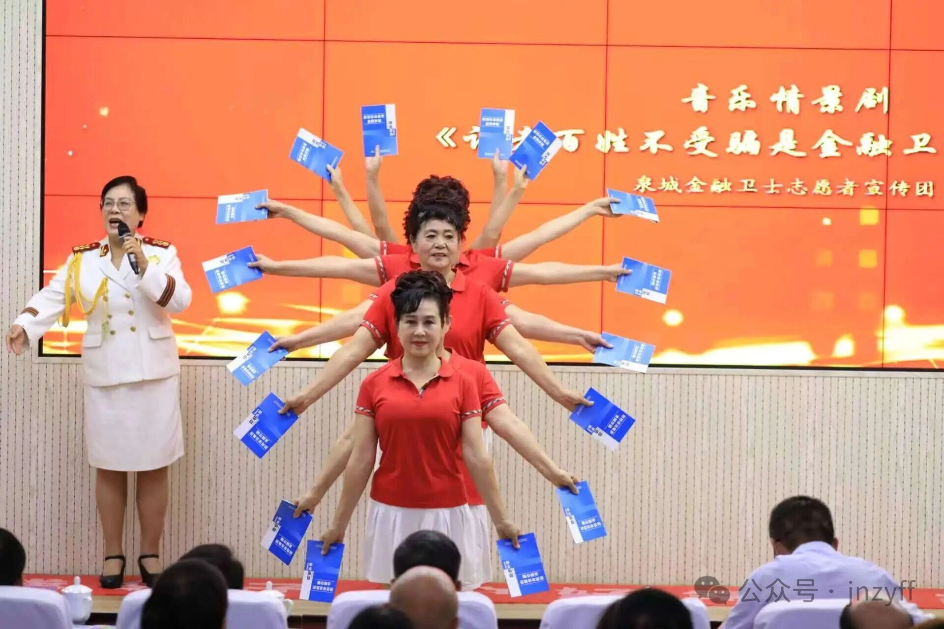随后,“反诈奶奶们” 轮番登场,献上了精心准备的反诈节目。她们用通俗易懂、生动有趣的表演形式,将防非反诈知识融入其中,让学子们在轻松愉快的氛围中学习和掌握识别诈骗、防范诈骗的技巧。同时,“反诈奶奶们” 还向学校赠送了寓意着 “筑牢防诈防线” 的书法作品,传递出共同守护校园安全的美好愿景。